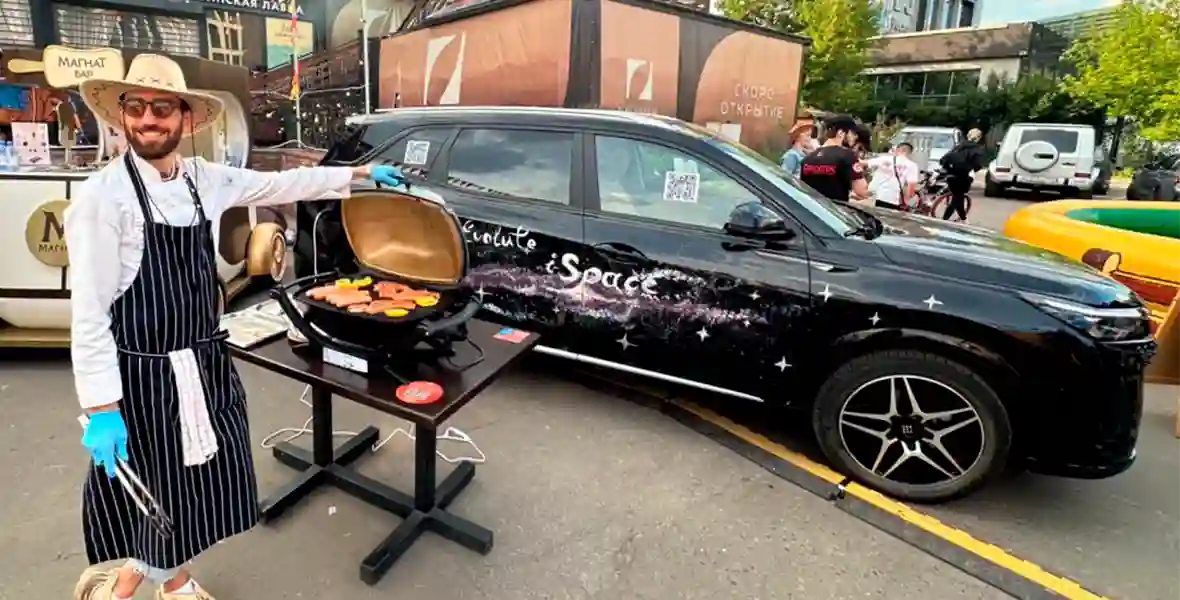 Семиместный гибридный EVOLUTE i‑SPACE стал сердцем кулинарного BBQ-шоу на Усачевском рынке. Кроссовер снабжал энергией электрогриль напрямую от аккумулятора, демонстрируя свою мощность и инновационные возможности.