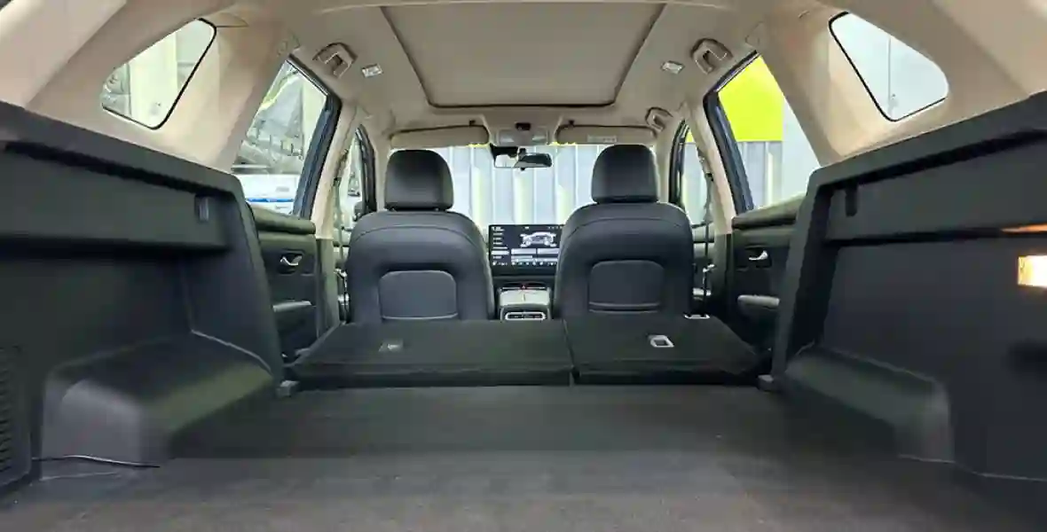 На втором ряду пятиместного варианта EVOLUTE i‑SPACE достаточный запас пространства. Также порадовали два дефлектора обдува на центральном тоннеле. Багажный отсек ранее исключительно 7-местного автомобиля впечатляет своей глубиной. Впрочем, боковины здесь не обиты войлоком и могут царапаться от перевозимых грузов. Кресла кроссовера складываются с соотношением 6-4. Полностью ровный пол не выходит – остаётся небольшая ступенька.