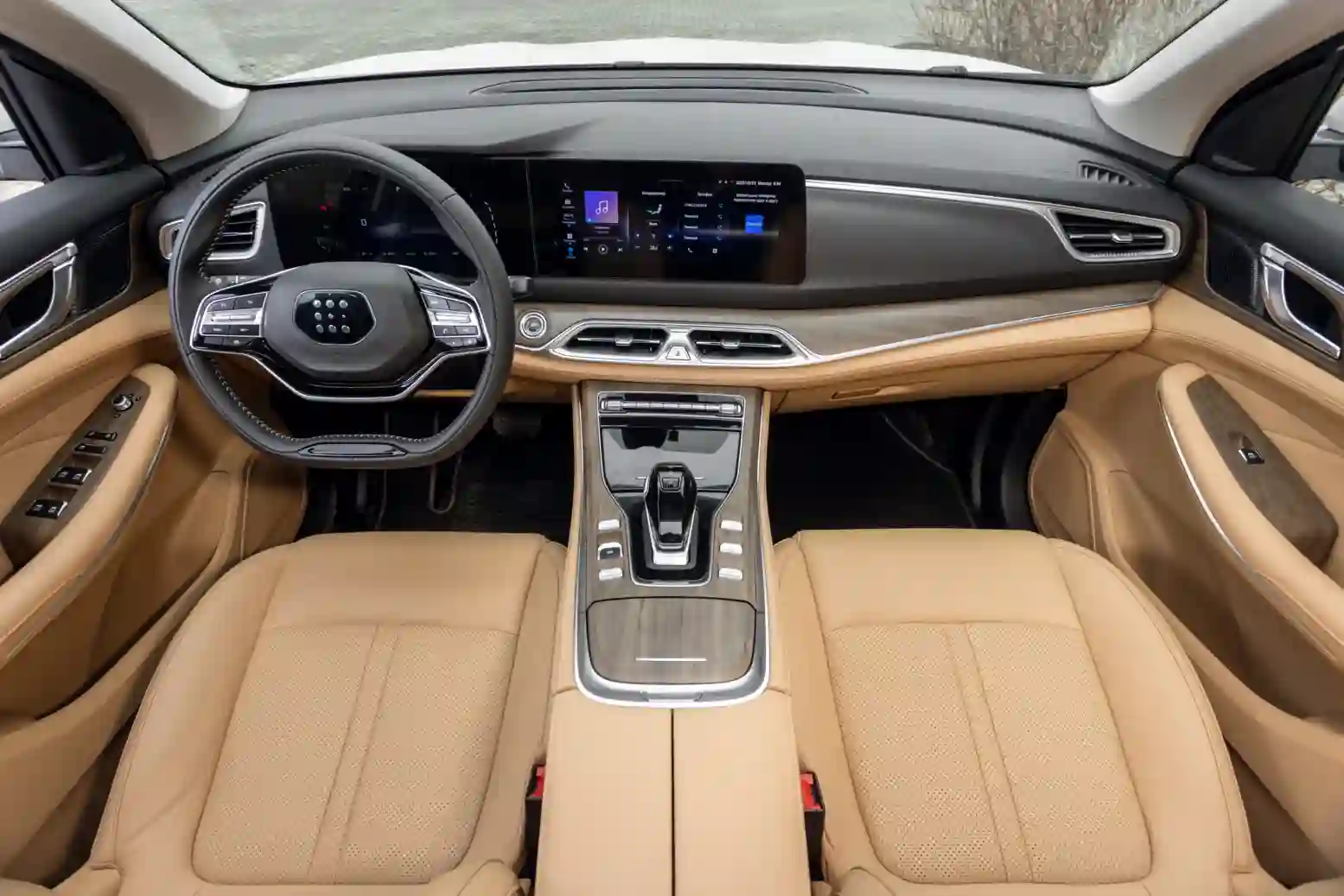 Повторимся, что комбинированная дальность хода EVOLUTE i‑SPACE составляет 1150 км, поэтому среднеразмерному (4760 мм) и высокому (1710 мм) автомобилю можно простить не самый ёмкий топливный бак 60 литров. Разок заправился – и три раза подряд можно, например, сгонять из Питера в Великий Новгород, и обратно.
